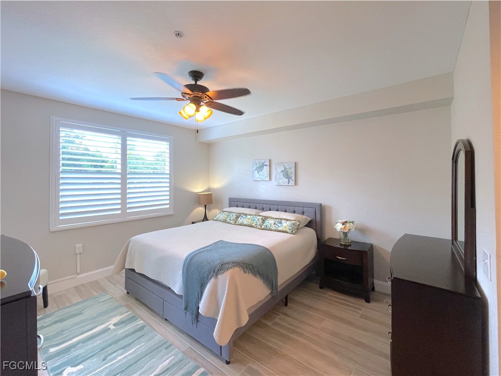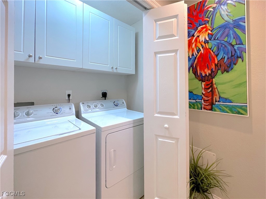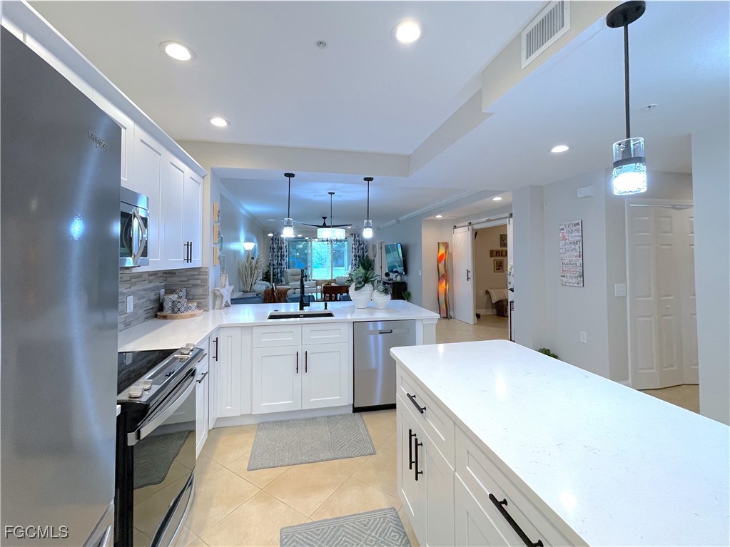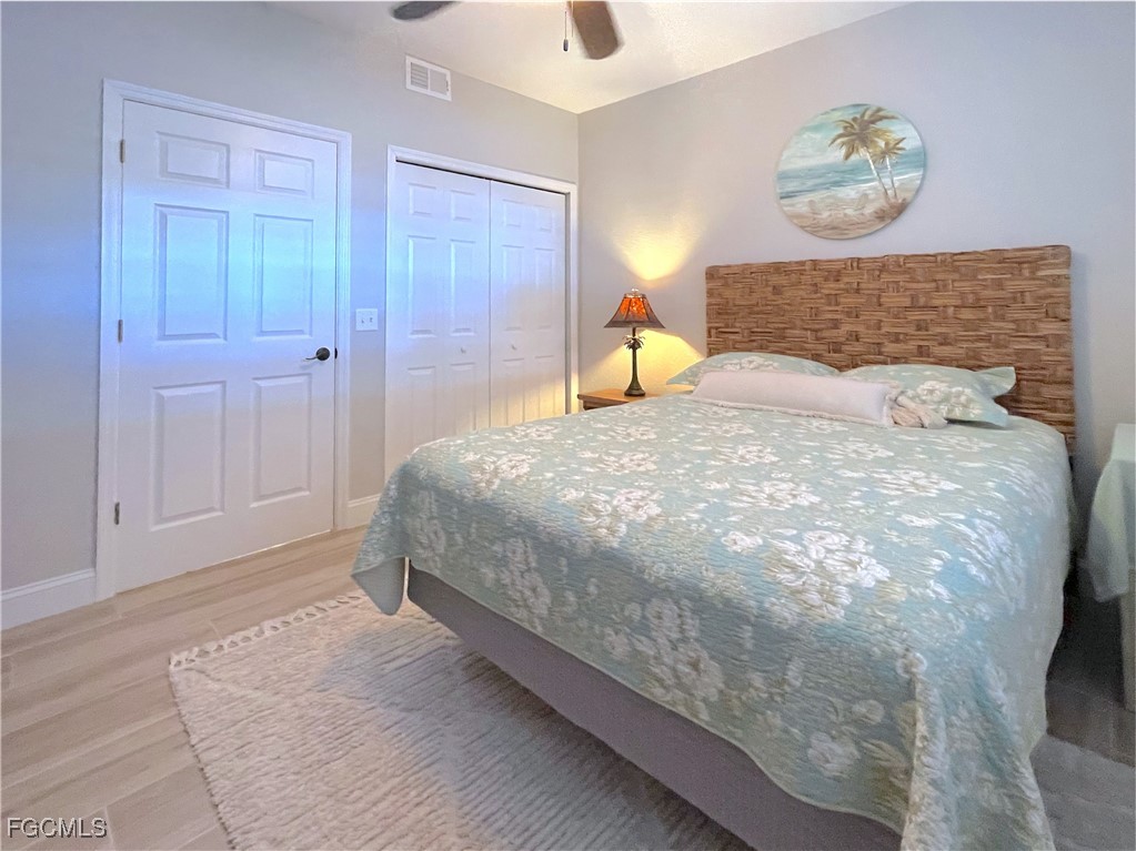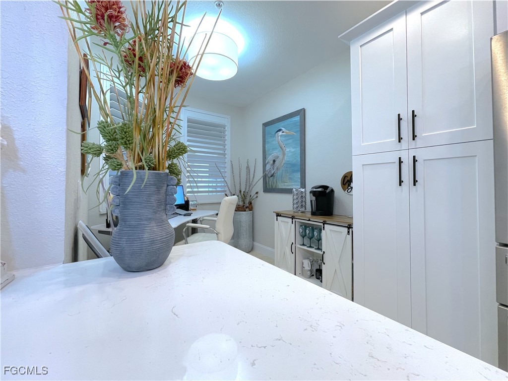 Stunningly renovated 2-bedroom plus den, 2-bath condo located in the highly desirable gated all-age community of Gulf Reflections! Step through the door and you’ll be greeted by a bright, open layout and a completely updated kitchen featuring sleek white quartz countertops, soft-close cabinetry, stainless steel appliances, and a spacious pantry for added storage. The split-bedroom design ensures privacy, with the primary suite offering peaceful lake views from your window, private lanai access, and an ensuite bath complete with private toiletry area, dual vanities, ample cabinetry, and a large walk-in closet. The guest bedroom and second full bath create a comfortable retreat for visitors, while the den serves perfectly as an office, craft room, or extra guest space. Relax and unwind on the screened lanai with no-see-um screens, surrounded by lush landscaping and tranquil views. An outdoor storage closet provides extra room for beach gear, bikes, and more. Gulf Reflections is a pet-friendly, all-age active community ideal for year-round residents, snowbirds, or investors. Short-term rentals are permitted, and residents enjoy resort-style amenities including a clubhouse, heated pool, hot tub, and fitness center. Located just minutes from Fort Myers Beach, Sanibel Island, and Bunche Beach, this first-floor condo also includes one covered carport space and one additional parking spot. Garages may be available for purchase periodically within the community.