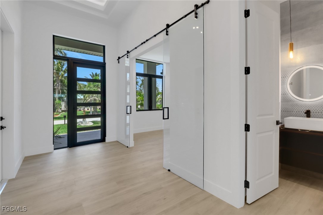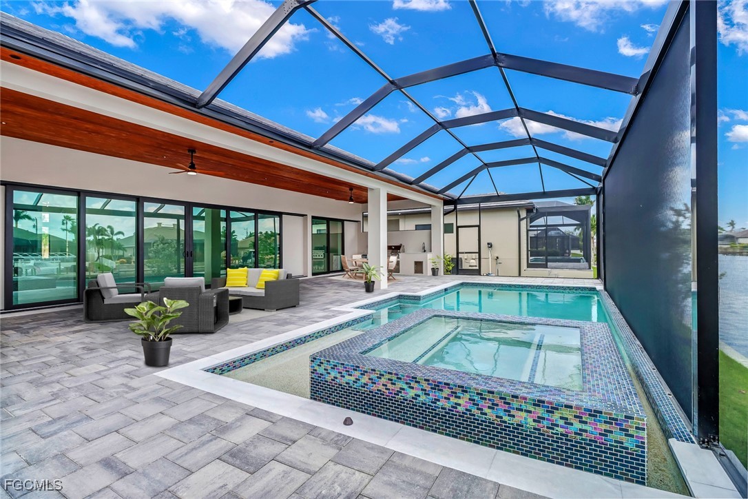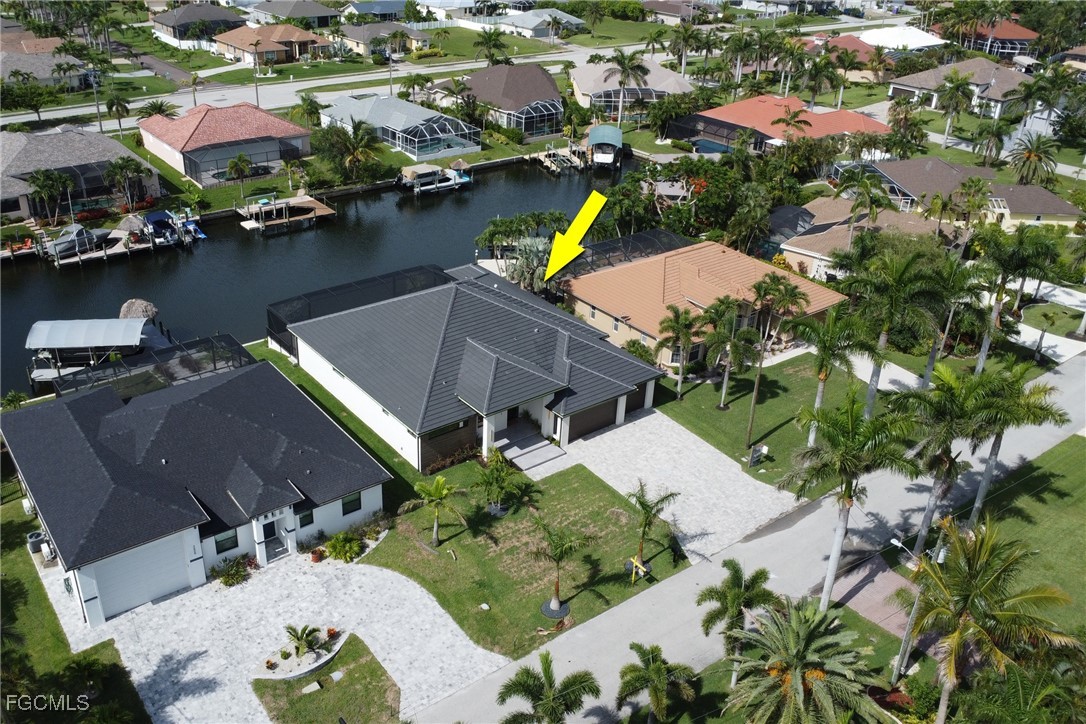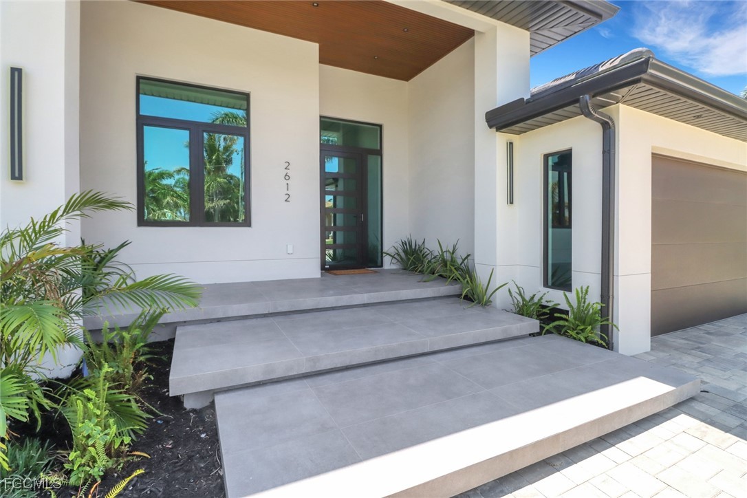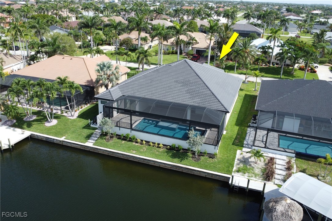 This brand-new stunning residence is nestled on a 115-foot-wide Gulf-access canal, offering ideal southern rear exposure—perfect for enjoying stunning sunsets and year-round sunshine. Spanning 2,844 sq. ft. of open-concept living, this thoughtfully designed home features 4 bedrooms, 3.5 bathrooms, and a versatile den/office. The sleek European-style kitchen is a chef’s dream, equipped with Bosch stainless steel appliances, a large center island with double waterfall quartz countertops, wine cellar and a seamless view of the expansive great room. Enjoy indoor-outdoor living through 23-foot-wide pocketing sliding glass doors that open to the oversized lanai. Step outside to your private outdoor oasis featuring a custom-designed saltwater pool with a stunning 360-degree spill-over spa adorned with sparkling glass tiles, color-changing LED lights, a sun shelf, and three built-in bar stools. Entertain effortlessly at the fully equipped outdoor kitchen, all beautifully framed by a 30-foot-wide panoramic screen that provides unobstructed water views. Interior upgrades include porcelain plank tile throughout, a dramatic 70” electric fireplace with a custom shiplap feature wall, soaring 14-foot tray ceilings with LED lighting, linear A/C diffusers, glass barn doors to the den, anti-fog backlit mirrors, and full glass shower enclosures. Additional highlights include LED floating entry steps, 3-car garage with epoxy flooring, and premium garage doors.