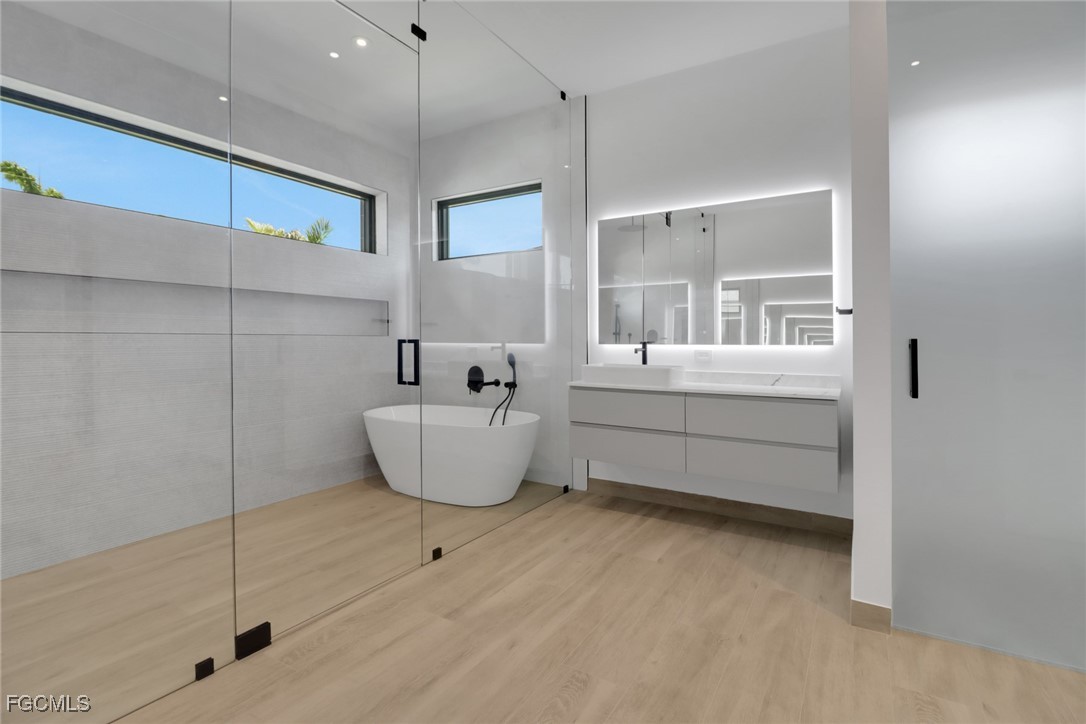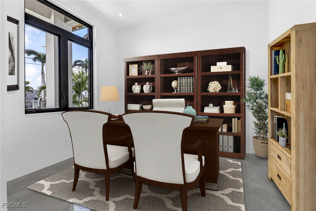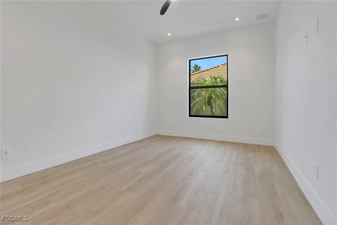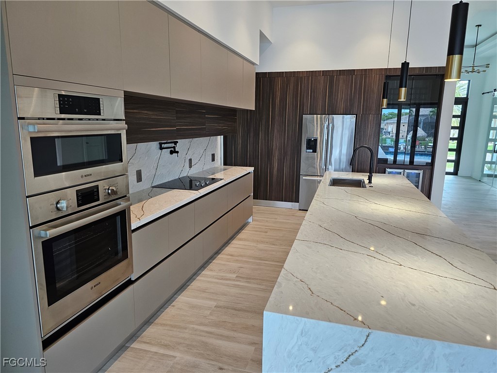 This brand-new stunning residence is nestled on a 115-foot-wide Gulf-access canal, offering ideal southern rear exposure—perfect for enjoying stunning sunsets and year-round sunshine. Spanning 2,844 sq. ft. of open-concept living, this thoughtfully designed home features 4 bedrooms, 3.5 bathrooms, and a versatile den/office. The sleek European-style kitchen is a chef’s dream, equipped with Bosch stainless steel appliances, a large center island with double waterfall quartz countertops, wine cellar and a seamless view of the expansive great room. Enjoy indoor-outdoor living through 23-foot-wide pocketing sliding glass doors that open to the oversized lanai. Step outside to your private outdoor oasis featuring a custom-designed saltwater pool with a stunning 360-degree spill-over spa adorned with sparkling glass tiles, color-changing LED lights, a sun shelf, and three built-in bar stools. Entertain effortlessly at the fully equipped outdoor kitchen, all beautifully framed by a 30-foot-wide panoramic screen that provides unobstructed water views. Interior upgrades include porcelain plank tile throughout, a dramatic 70” electric fireplace with a custom shiplap feature wall, soaring 14-foot tray ceilings with LED lighting, linear A/C diffusers, glass barn doors to the den, anti-fog backlit mirrors, and full glass shower enclosures. Additional highlights include LED floating entry steps, 3-car garage with epoxy flooring, and premium garage doors.
