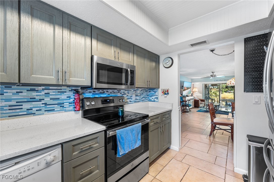 Inside, you’ll find a **bright, open layout** with **tile floors throughout**, making cleaning a breeze and keeping things cool year-round. The **updated kitchen** features modern finishes and plenty of cabinet space, ideal for everyday cooking or entertaining friends. Both bedrooms are comfortably sized, and the two full baths provide practicality for owners and guests. The unit could use a **fresh coat of paint**, giving the next owner an excellent opportunity to add their own personal touch.