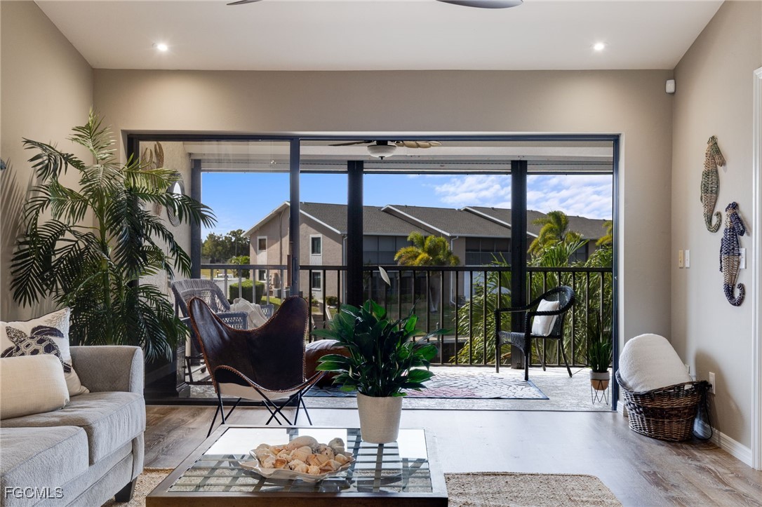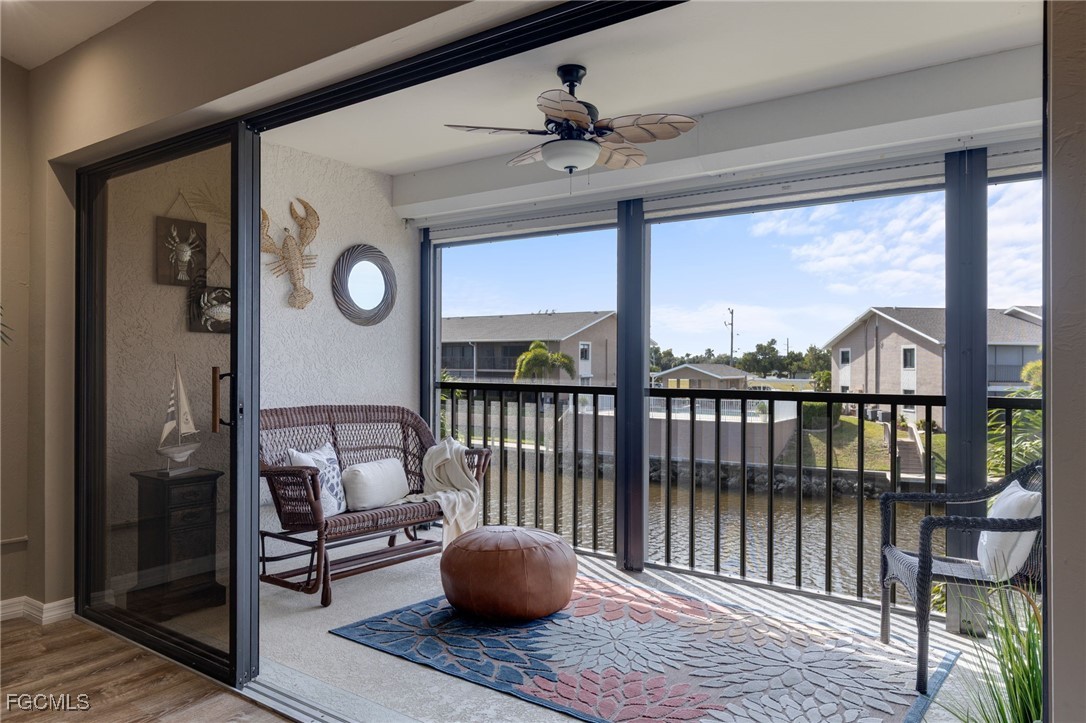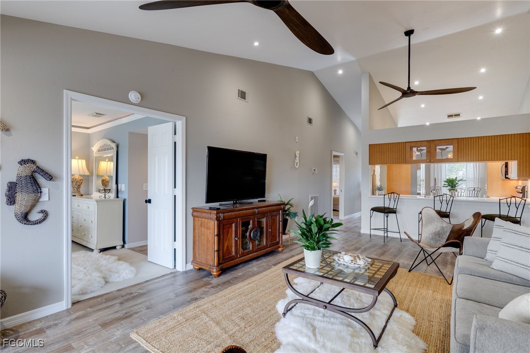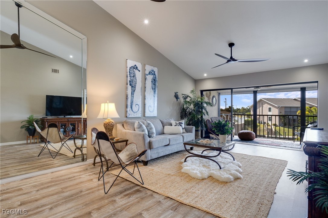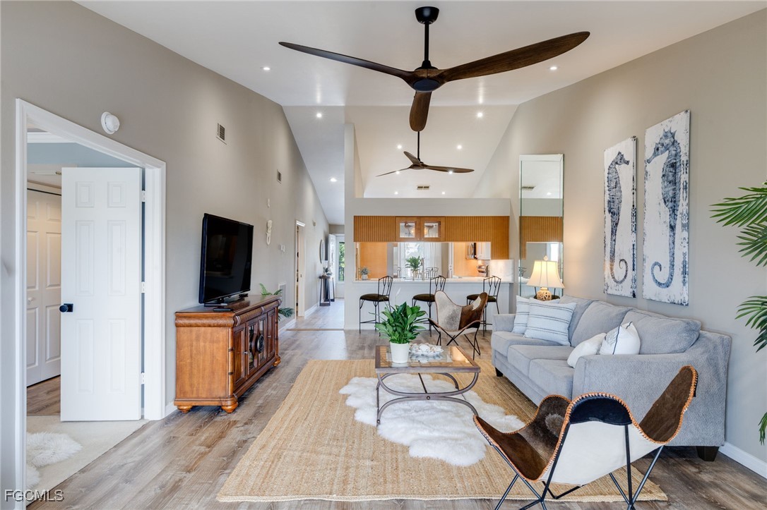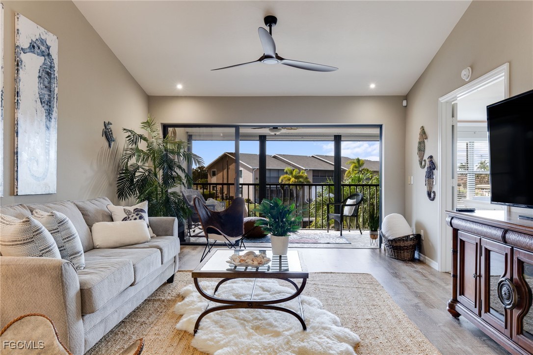Beautifully appointed condo in the heart of south Cape Coral that is not to be missed. If you are considering purchasing a gulf-access, maintenance-free residence, this is the ONE! This unit has been exceptionally upgraded both functionally and with beautiful, high end design elements. Clean, elevated furnishings meld wonderfully with whimsical artwork and soaring ceilings, and with the western exposure of this home, you can take it all in while toasting the gorgeous sunsets from your lanai. During the day watch the boats cruise by and bring your own boat to secure at your dock along the community seawall just below you. Just one bridge and a short ride to the river makes it easy to spend a day sightseeing, fishing or just relaxing on one of the many tranquil beaches nearby. Newer AC, shutters, seawall, appliances, and soon a freshly painted exterior make this condo a carefree, secure home or your personal vacation paradise.