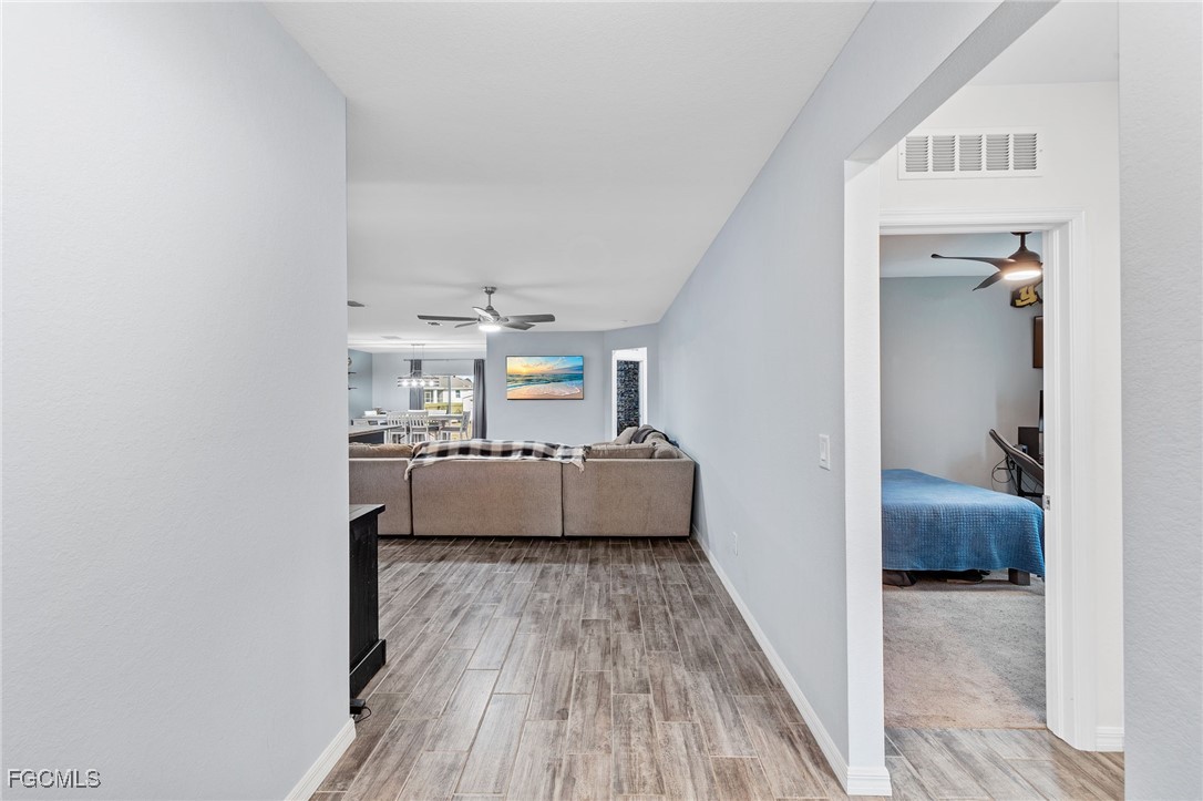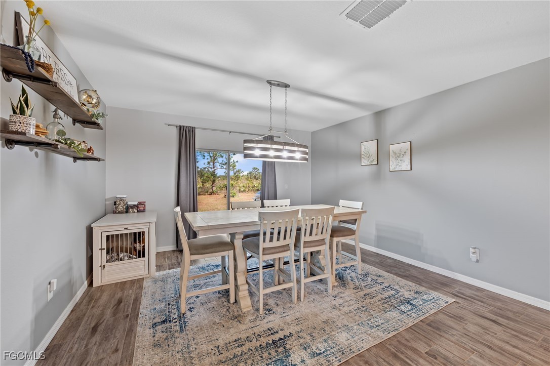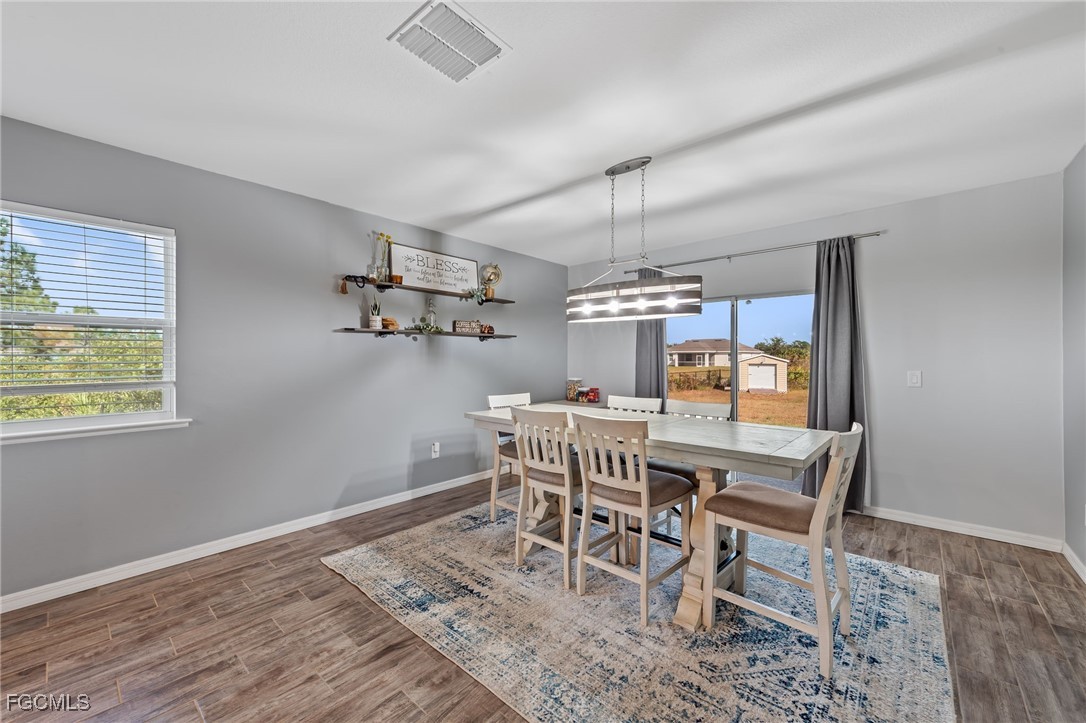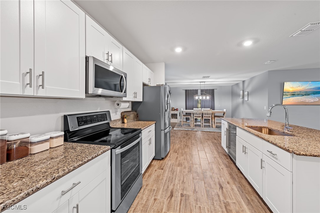 Don't pay more for new construction! Built in 2020, this beautifully maintained 4/2/2 offers nearly 1,900 sq ft of modern living space with wood plank tile flooring throughout the main areas, upgraded lighting and fans and a modern open layout. The kitchen features granite counters, stainless steel appliances, a wine cooler and a spacious pantry. The primary suite includes dual sinks, a walk-in shower, and a large walk-in closet. Three wall-mounted flat screen TVs, washer and dryer, Ring doorbell and camera system and a storage shed all convey. Protected with included hurricane shutters that will also decrease your insurance premium. Enjoy the HUGE ½-acre fenced yard with plenty of room for a pool, and peace of mind knowing it is not located in a FLOOD ZONE. Move-in ready and loaded with upgrades, this home truly has it all!