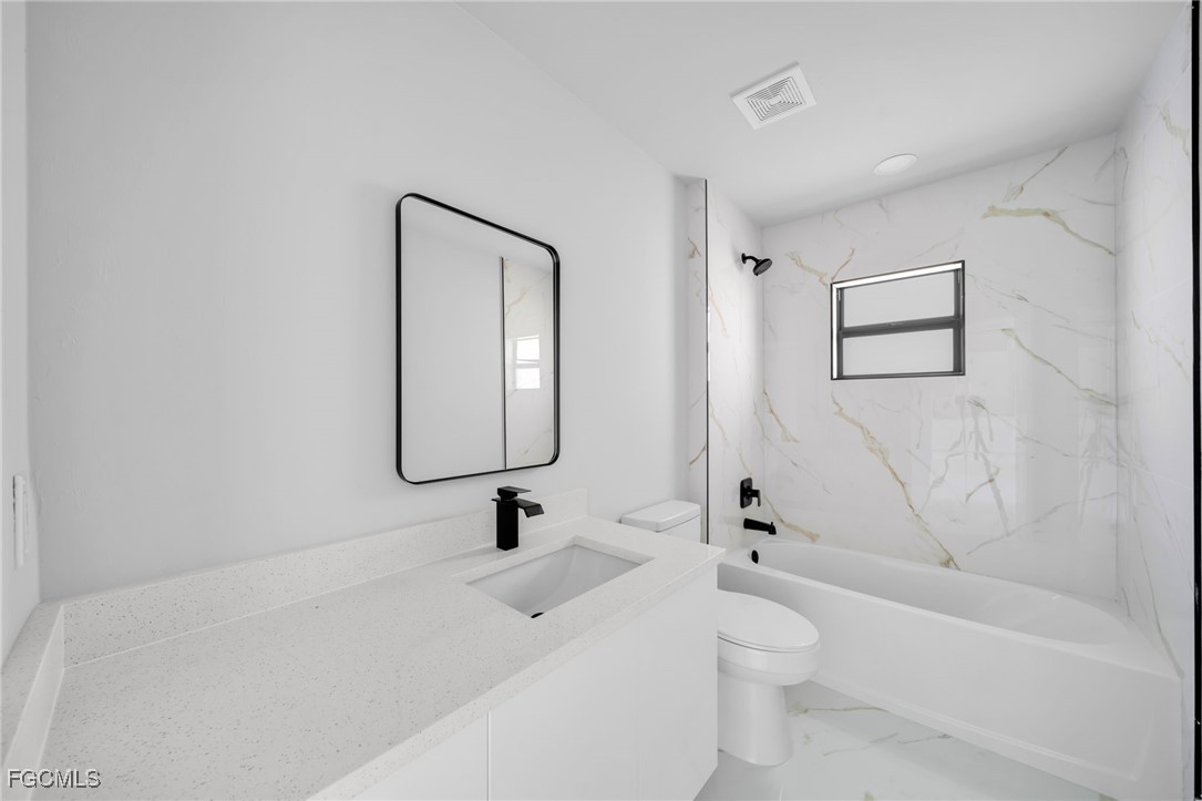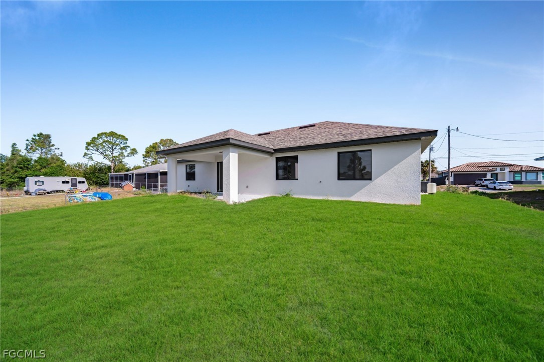 Modern living in SW Lehigh Acres! This stunning new home features an open layout with soaring ceilings, impact windows/doors, and sleek tile throughout—no carpet. Enjoy a designer kitchen with acrylic cabinets, quartz waterfall island, and stainless appliances. Luxurious baths, floating vanities, and a versatile den perfect as an office, gym, or playroom. Covered lanai, big 2-car garage, and no HOA! The pictures featuring the furniture are virtual staging.
