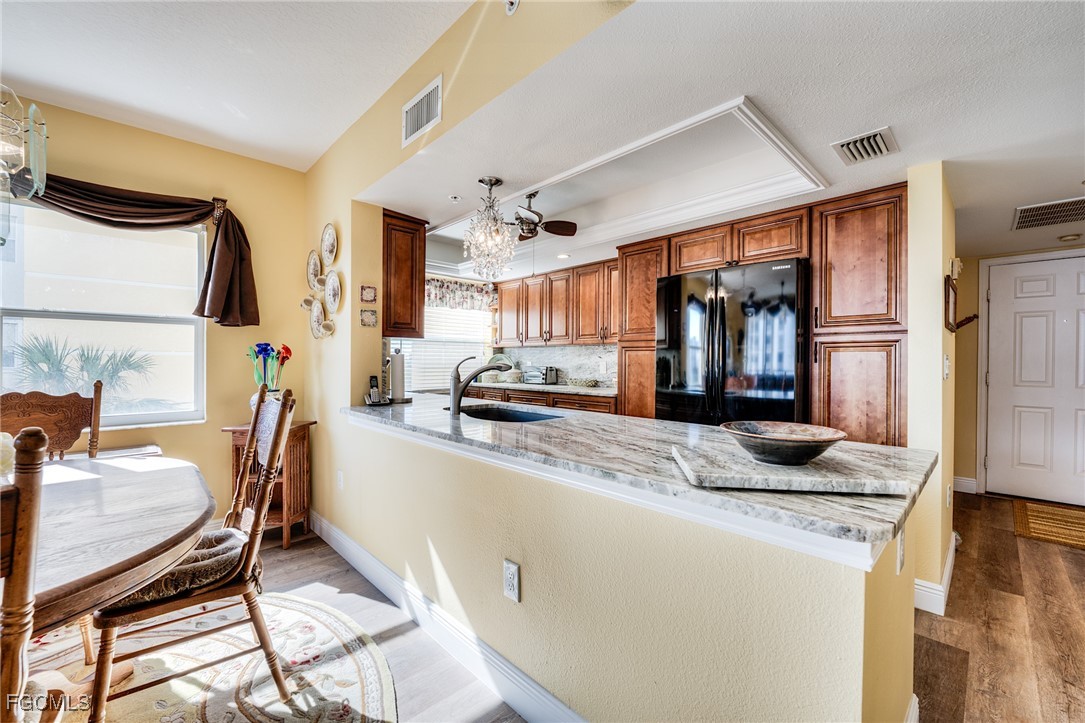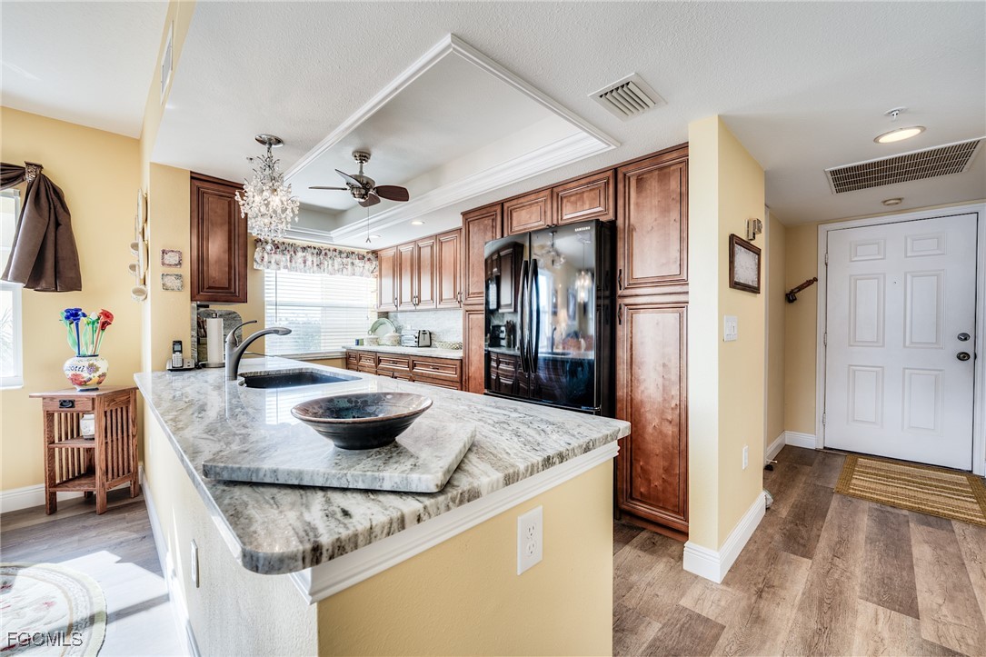 THREE BEDROOM END UNIT CONDO Beautifully updated w/ luxury vinyl plank flooring, high ceilings, loads of natural light, electric hurricane shutters on all windows/lanai and perfectly located on the desirable south end of Fort Myers Beach. This lovely and comfortable residence offers a split bedroom floorplan with primary suite on the canalside and guest suites on the other. Primary suite with a generous walk-in closet, slider access to lanai and updated en-suite full bath with tile floor, double sink granite top vanity and walk-in shower. Main living area features luxury vinyl plank flooring offering the ideal blend of comfort and style, making it the perfect retreat for those seeking a relaxed coastal lifestyle whether you are a boater, beachgoer or or just want to enjoy the island life. Relax on your screened in lanai and watch the boats come and go, island birds soaring and bay breezes. The well designed kitchen with warm, rich custom wood cabinetry, granite counters, tray ceiling trimmed with crown & matching suite of appliances: all perfect for culinary enthusiasts and entertaining guests.Two spacious guest bedrooms/Office w/ plenty of storage and windows offering natural light. Laundry closet with full size washer/dryer and shelving. Enjoy the convenience and protection of under building parking, electric hurricane shutters providing added security and storm protection. In the Hibiscus Pointe community, you’ll find High speed Internet/WiFi & Direct TV are included, an active clubhouse, a beautifully maintained swimming pool and spa, pickleball and tennis courts, a fishing pier, grilling areas, shuffleboard, a walking path, and deeded beach access. Just a short walk to the pristine sands of Fort Myers Beach, this condo is also conveniently located close to Lovers Key State Park, shopping & dining. Just a short trip to Bonita Springs/Estero and Naples. Structural Integrity Reserve Study -SIRS report, was completed for Hibiscus Pointe Condominium Association Inc. Don’t miss your chance to own this exceptional condo and experience the ultimate in coastal living. Schedule your private showing today!