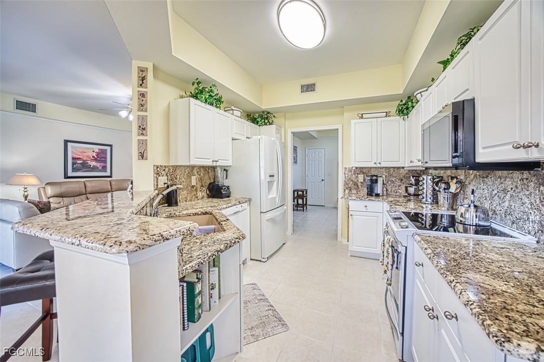 The kitchen features granite countertops and upgraded appliances. Both bedrooms offer ensuite baths, with the primary suite showcasing dual vanities, and a walkin shower. Tile throughout. The spacious 2-car garage includes additional room for beach, biking, or fishing gear.