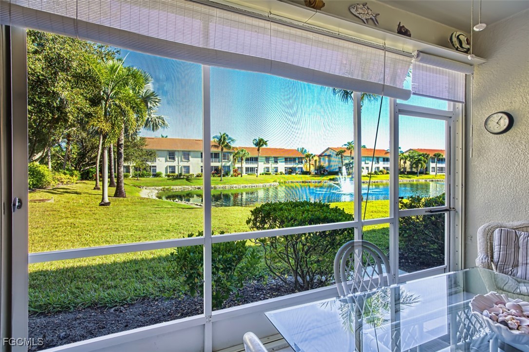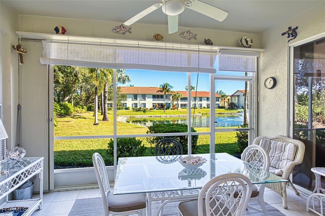 Featuring a 2-bedroom, 2-bath split floor plan plus a flex room with pocket doors—perfect as a home office, guest room, or fitness space—this home provides both comfort and versatility. The private eastern-facing screened lanai offers tranquil sunrise views over the water and is protected with accordion storm shutters.