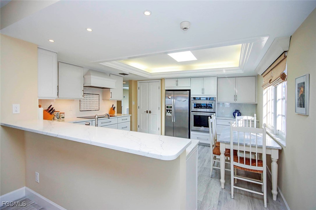 Inside, you’ll find light coastal décor, wood-look tile flooring, and white coastal cabinetry. The large eat-in kitchen opens nicely to the living space. The spacious primary suite includes a luxurious walk-in shower and soaking tub, while both guest bedrooms feature private baths and lanai. A separate den offers flexible space for an office or media room.