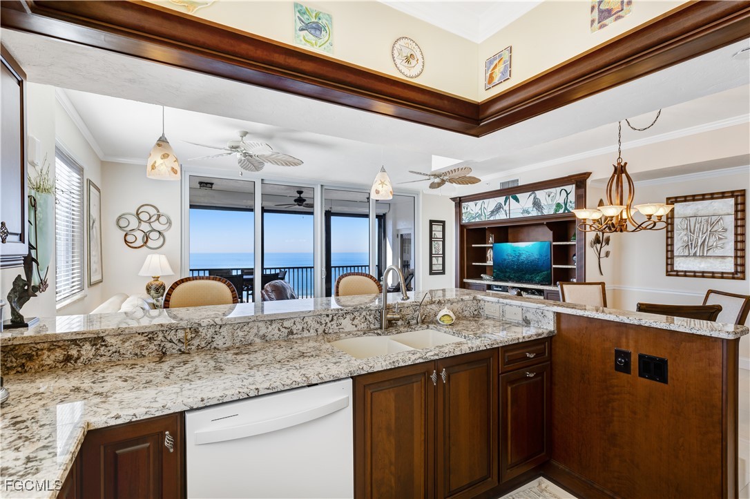 The custom kitchen has been tastefully updated with rich wood cabinetry, granite countertops, and abundant natural light that fills this corner residence. All windows and sliders are impact-resistant, the lanai features new electric storm shutters, there is a new hurricane-rated entry door, and all assessments have been paid. An in-residence laundry room provides added storage and convenience.