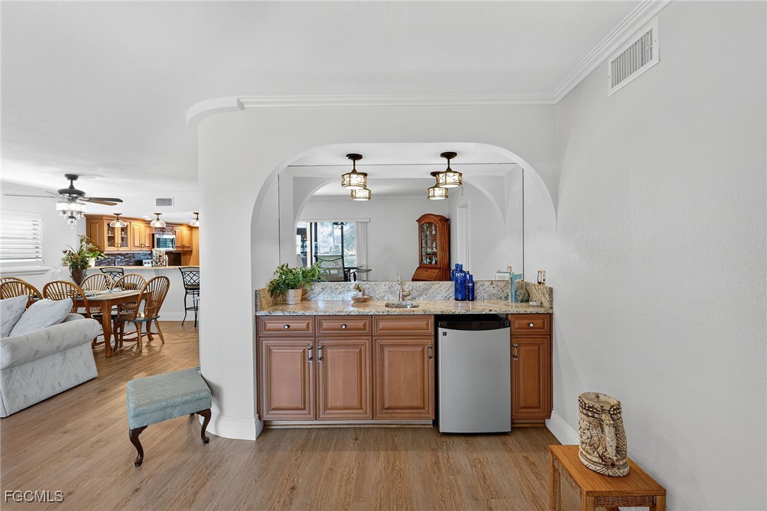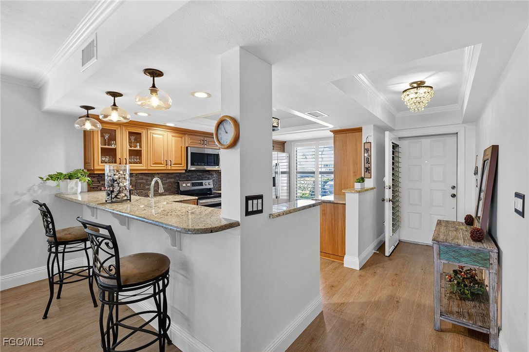 The beautifully upgraded kitchen boasts granite countertops, rich cabinetry, and ample storage, ideal for both everyday cooking and entertaining. A front den provides a versatile space that can serve as a home office, sitting room, or reading nook. There’s also a convenient wet bar, perfect for unwinding with an evening drink.