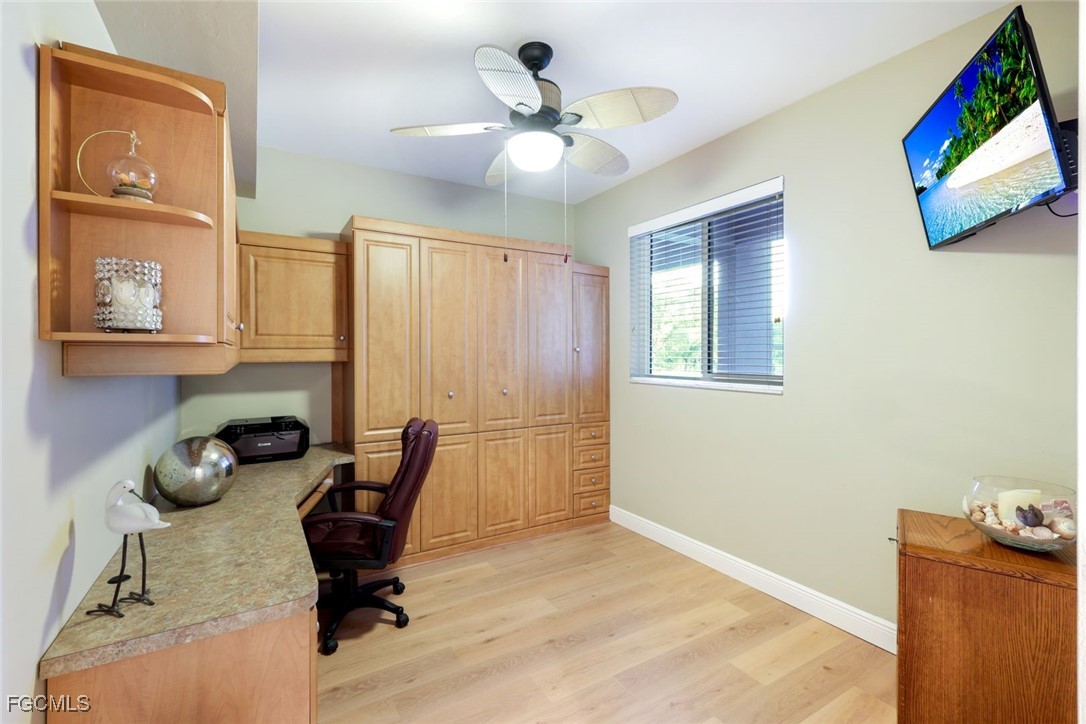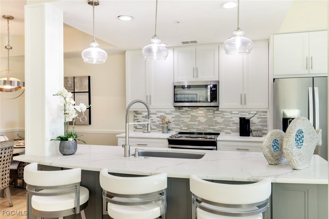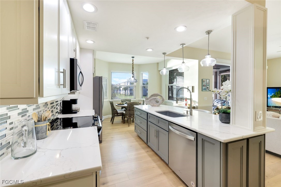 BEAUTIFULLY UPDATED and METICULOUSLY MAINTAINED Brookside unit in the tropically landscaped Heritage Pointe community in South Fort Myers. This 2nd FLOOR, 2 BEDROOM / 2 BATH condo features an OPEN FLOOR PLAN with FANTASTIC VIEWS of Heritage Pointe’s large lake with lighted water features. Offered TURNKEY with high-quality furnishings, décor, and assessories, this unit has been significantly updated with quality materials and lots of attention to detail. Updates include a kitchen redesign making it more open to the living & dining rooms, cabinetry to include drawers on the lowers, a large single level island-like quartz topped serving & eating area, an eye-catching backsplash, numerous stylish light fixtures, newer appliances, under cabinet lighting, and more. No carpet in this unit. It has gorgeous luxury vinyl plank flooring throughout the living areas, kitchen, breakfast nook, and bedrooms and tile flooring in the bathrooms. Taller baseboards, chair rail, and plantation shutters on all windows complement the classy, neutral color scheme. Both bathrooms feature elegant ceramic tiled showers with glass enclosures, new vanities with soft close drawers, double sinks in the primary ensuite, plus unique plumbing hardware & light fixtures. The guest bedroom offers great utility with a queen-size Murphy bed, extra storage, and a built-in desk. No need to worry about storm protection. All windows have recently been replaced with PGT impact glass windows and the west-facing lanai is equipped with electric StormSmart Kevlar storm screens that also serve as a sunscreen. Also included is a deeded extra storage unit located just steps from the front door & covered parking on the building side of the parking lot. High-definition fiber-optic based TV & Internet, water/sewer, and much more are included in the comparably low maintenance fee. Heritage Pointe is a financially sound, pet-friendly community located close to the beaches, near Wakahatchee Park & Recreation center with tennis & pickleball courts, Health Park Medical complex, several pharmacies & grocery stores, shopping, restaurants, and a variety of entertainment venues. Community amenities include a recently renovated clubhouse, resort-style heated pool & spa, fitness room, library, walking path, plus a new community gathering area featuring gas grills, bocce ball, cornhole, putting green. The community offers an extensive social calendar of activities & events. DON’T HESITATE – BOOK YOUR PRIVATE SHOWING TODAY.