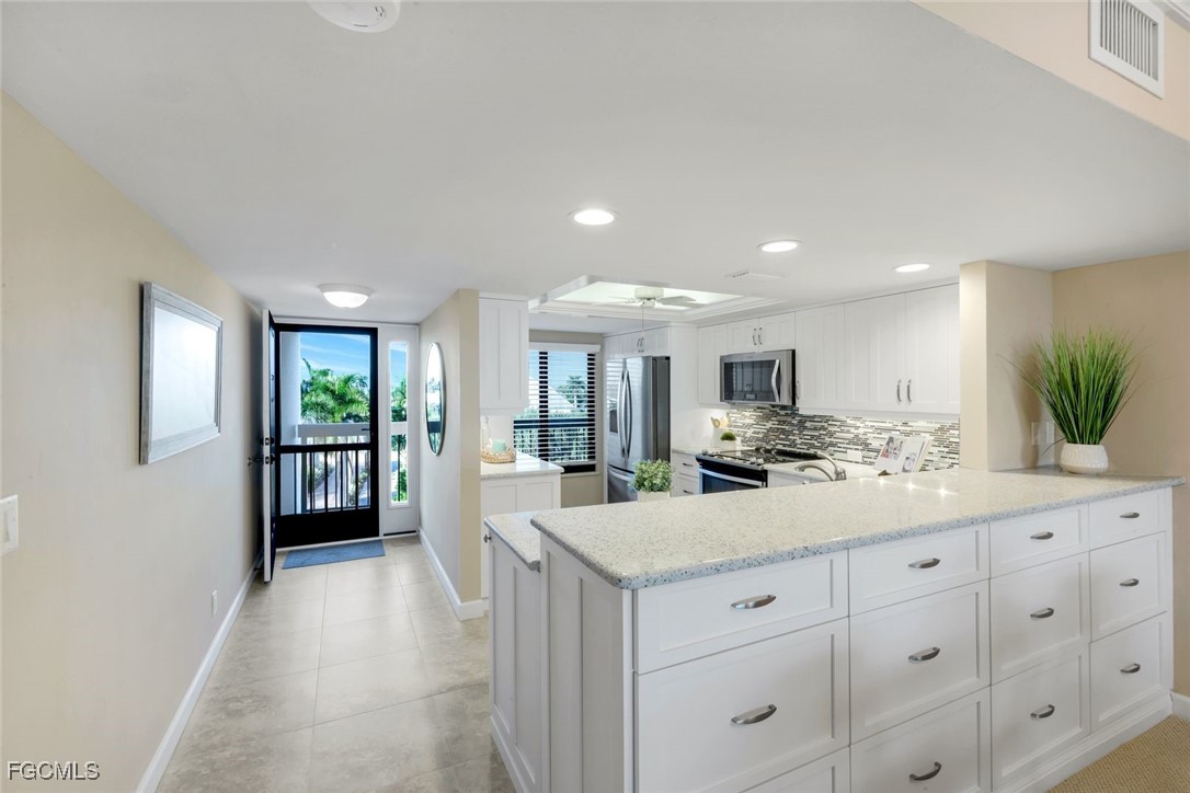 Indulge in panoramic, unobstructed Gulf views from this elegant top-floor residence in the prestigious Nutmeg Village community. This impeccably remodeled 2-bedroom, 2-bath coastal retreat blends refined design with effortless comfort. Reimagined in 2017 by Cornerstone Builders, the gourmet kitchen boasts quartz countertops, a designer tile backsplash, soft-close custom cabinetry, abundant storage, and premium stainless-steel appliances.