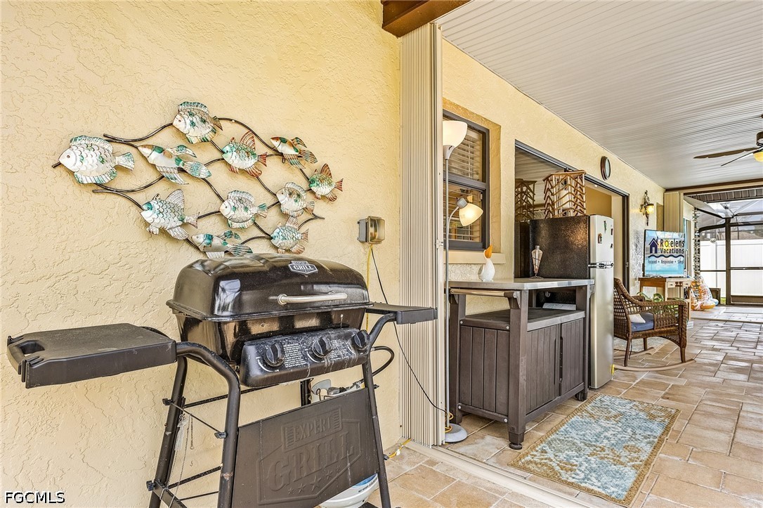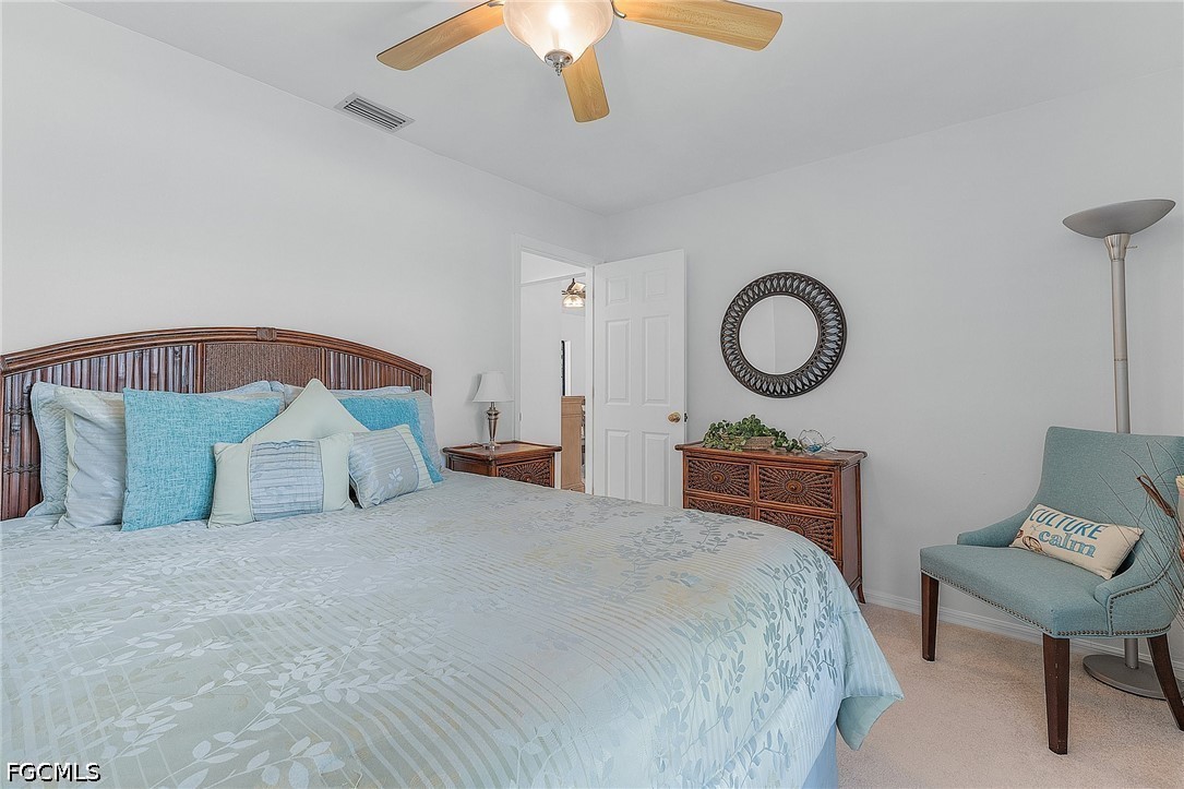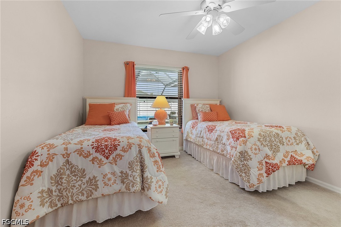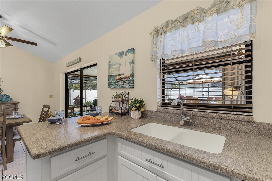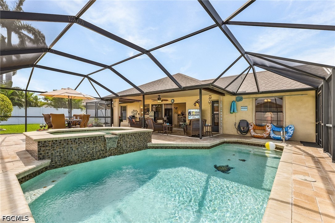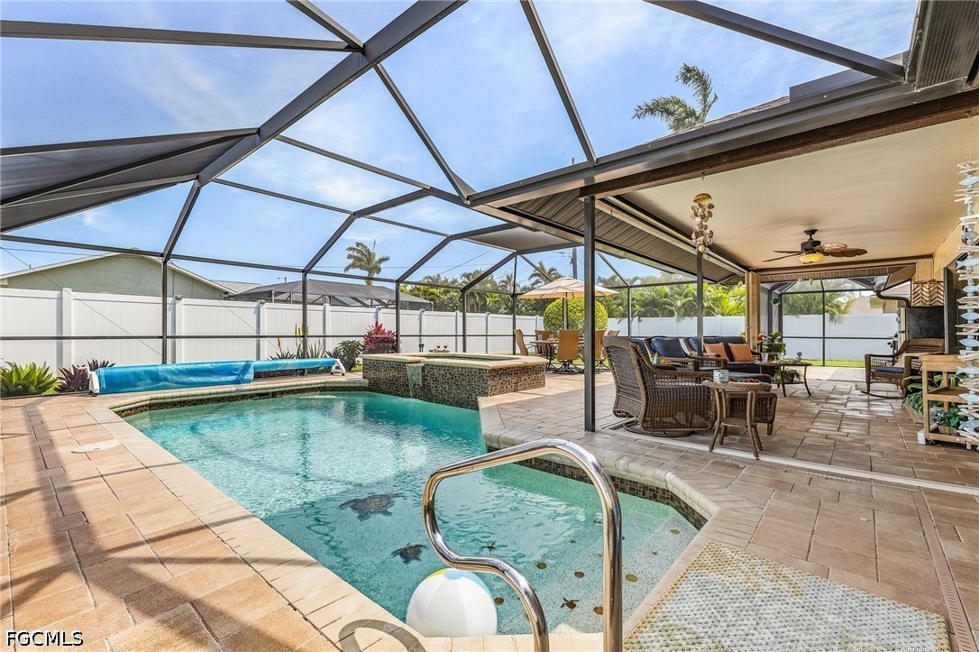 Welcome to your Florida dream home, a beautifully maintained 3-bedroom, 2-bathroom single-family residence perfectly situated in a quiet, established neighborhood in Southwest Cape Coral. This home is ready for you to move in and enjoy the quintessential Florida lifestyle year-round, featuring soaring vaulted ceilings and a skylight in the living area that creates a bright, airy atmosphere. The "chef’s delight" kitchen is equipped with contemporary cabinetry, sleek countertops, and high-end stainless steel appliances, while the thoughtful split-bedroom design provides maximum privacy for the primary suite, complete with a walk-in closet and ensuite bathroom. Convenience meets functionality with an indoor laundry room featuring a laundry tub and extra storage. Step through the sliding glass doors to find your own private oasis: a fully screened-in lanai with a sparkling heated pool, and spa, and a dedicated pool bath for easy outdoor living. The lot is fully fenced for secure privacy and surrounded by lush, manicured tropical greenery maintained by a built-in sprinkler system, ensuring fantastic curb appeal and a serene environment for long-term residency.
