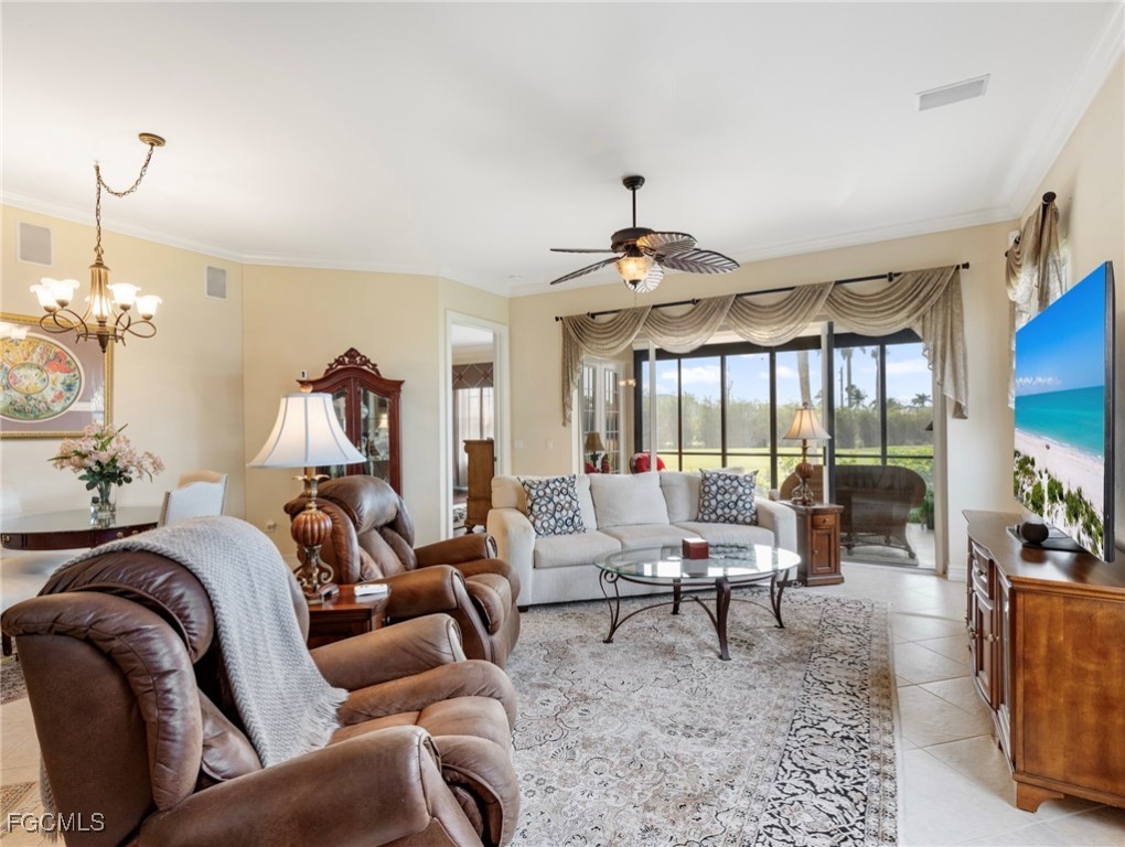 Stunning, impressive, and beautiful are the words you'll use to describe this coach home nestled on the 13th hole in Gulf Harbour Yacht & Country Club. With over 2,000 s/f of living space, this TURNKEY 2 bedroom + Den first floor home creates a feel of grandeur the moment you enter. The entryway hall alcoves set the tone with significant art treatments with interesting stories. Tile floors flow throughout the main living area, and hand scraped wood floors encompass the bedrooms and den. Volume ceilings with crown molding create plenty of space and light, while designer touches and owner upgrades are abound. The kitchen offers granite countertops, stainless steel appliances, a natural-gas cooktop, plus ample areas to gather the family for gourmet meals. The primary suite is split from the guest bedroom for privacy and has two large closets-one walk-in with designer shelving. The ensuite bath is spacious with separate shower and jetted soaking tub, plus double vanity and vessel sinks. The outside patio has been converted into an under air usable space to include tile floors plus sliding sun shades and even electrical hurricane shutters for protection. Long range waterfront views never looked so good! Two car garage with epoxy floor coating a plus! AC is 11 years old with a 1-year remaining warranty. The community of Coronado offers a community pool. Additionally, stellar amenities are all optional at Gulf Harbour Yacht & Country Club. Golf and Sports Memberships include an array of activities such as golf, tennis, a state-of-the-art fitness center, full service spa, several restaurants, private beach, and a deep-water marina. You are now HOME! Agents-please see confidential comments.