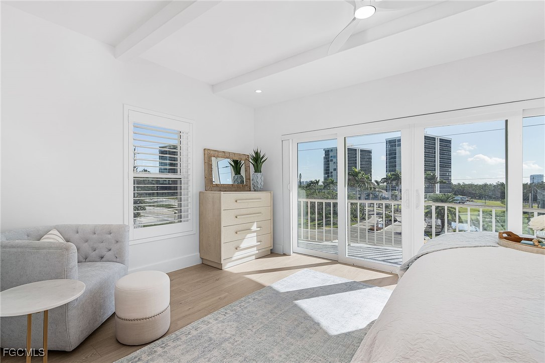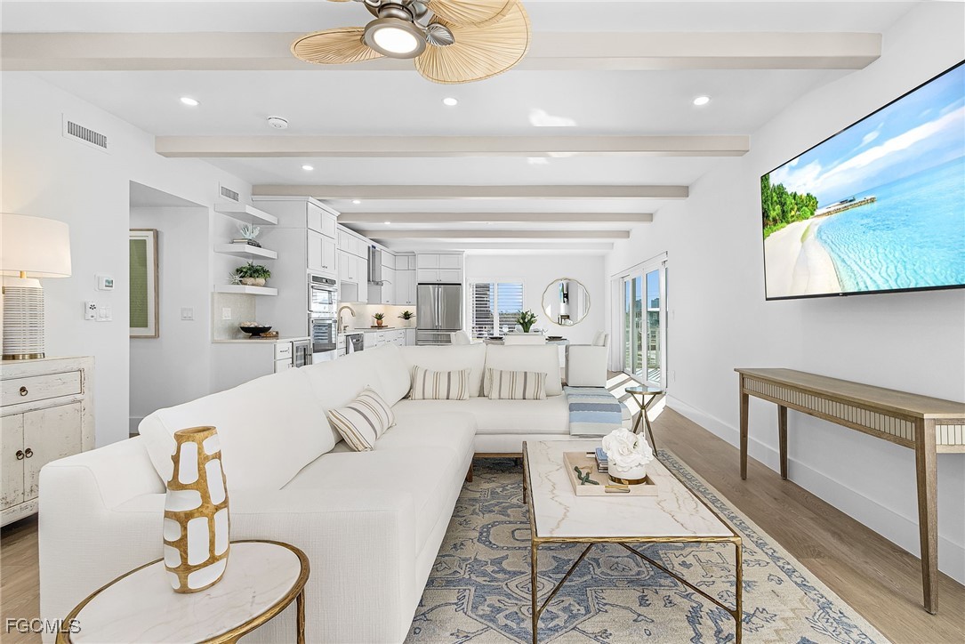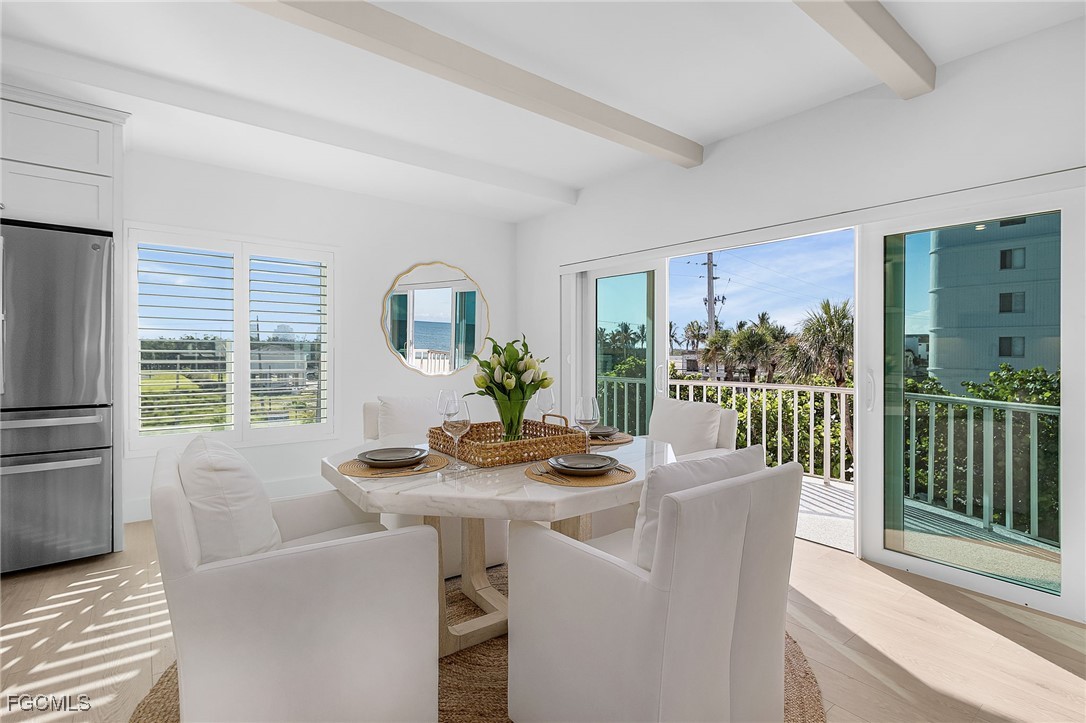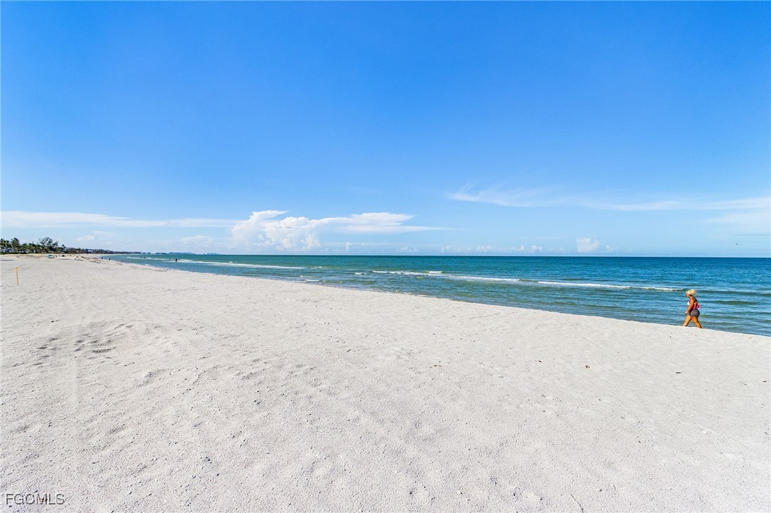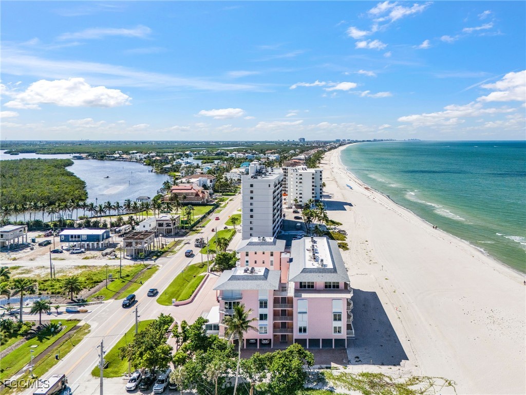 Discover coastal living at its finest in this stunning 2 bed/2bath condo that puts you just steps away from pristine Gulf waters right on Bonita Beach! This turnkey, 1300 sq ft. retreat, offers breathtaking Gulf views from every living space, making each morning coffee a memorable experience. The open floor plan seamlessly connects the living areas, enhanced by decorative ceiling beams and modern recessed lighting that creates an inviting atmosphere. The kitchen showcases elegant quartz countertops paired with crisp white shaker cabinets featuring soft close functionality, complemented by brand new stainless steel appliances, built in wine fridge and hood. Tile flooring flows throughout the entire unit, providing both beauty and easy maintenance. Two private patio spaces extend your living area outdoors. One private patio is accessible from primary bedroom and the other opens from the dining room/living space perfect for enjoying Gulf breezes and sunset views. The primary bathroom features dual vanity sinks, custom cabinetry, an oversized tiled shower with seamless glass doors, and luxurious quartz countertops. The guest bathroom mirrors this quality with new cabinets, quartz surfaces, and a sleek glass shower door. Practical amenities include an in unit laundry room and new, never used furnishings that convey with the sale. The building offers a community pool and sits directly on the Gulf, providing immediate beach access. Located on Bonita Beach with convenient proximity to Publix, restaurants, shopping, Lover’s Key State Park, Marina’s and Fort Myer’s Beach. This coastal haven combines luxury living with everyday convenience. Whether you're seeking a permanent residence or vacation retreat, this immaculate condo delivers the ultimate Gulf Coast lifestyle.