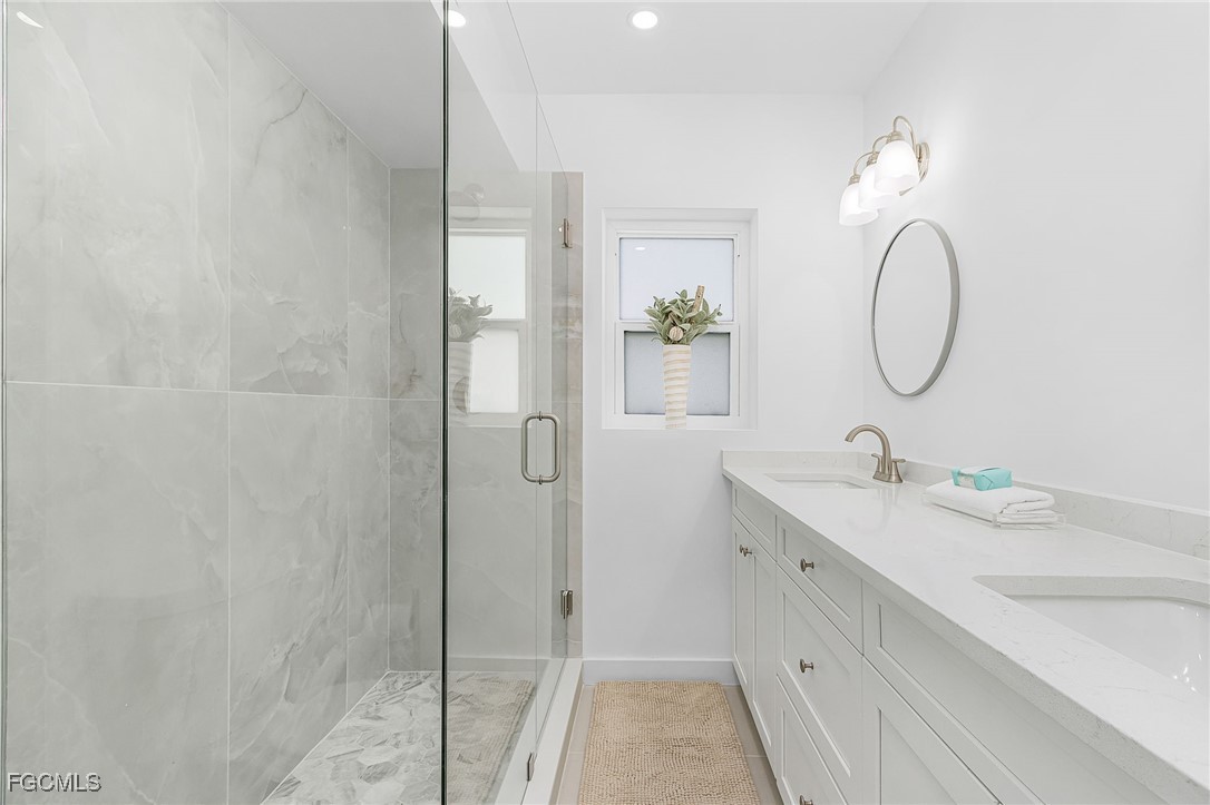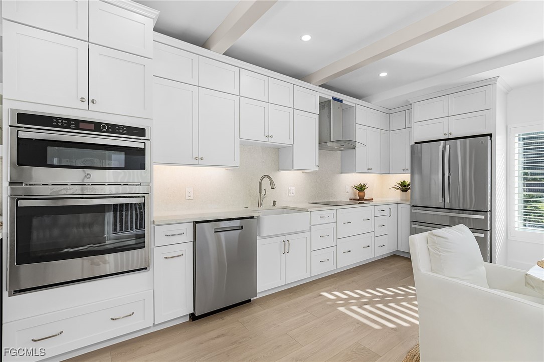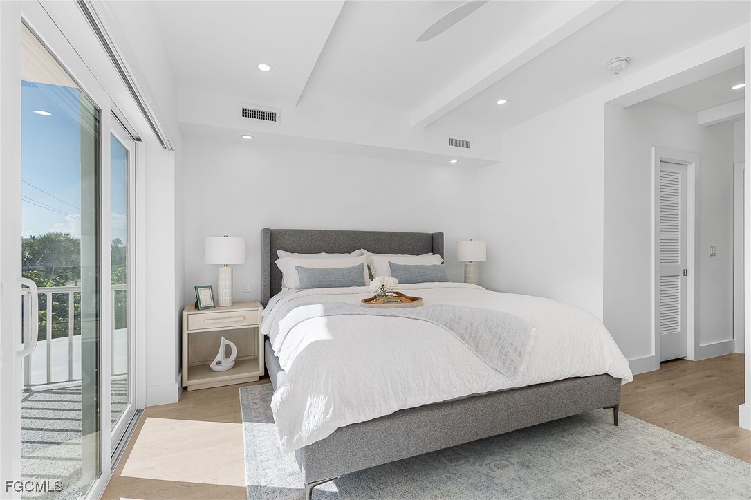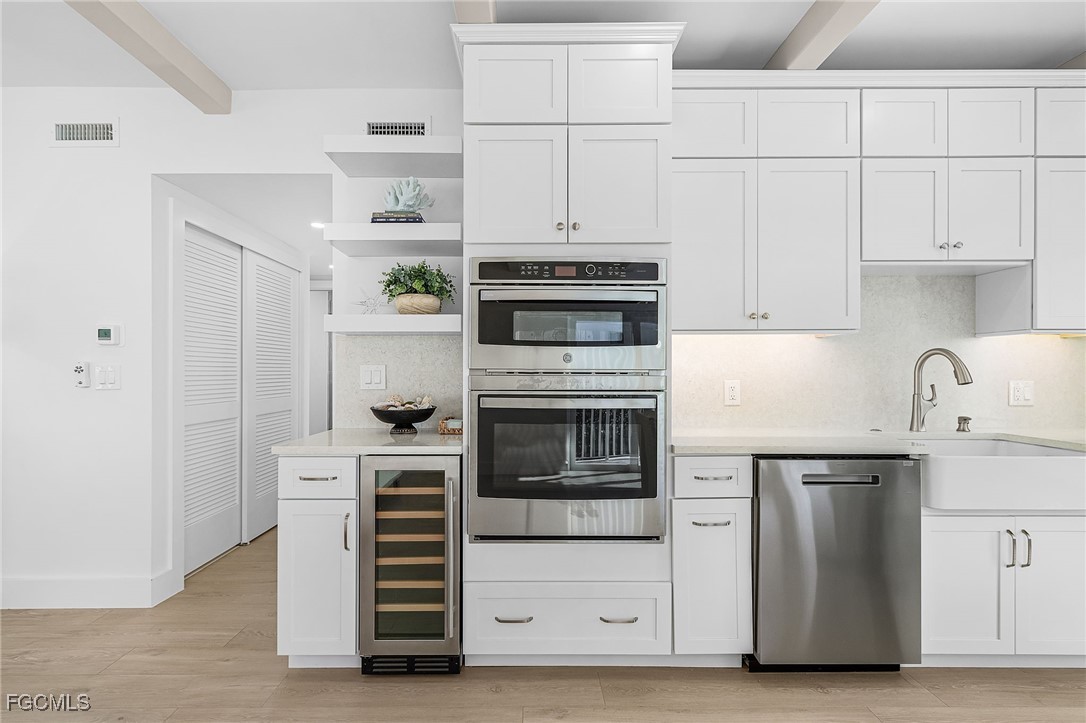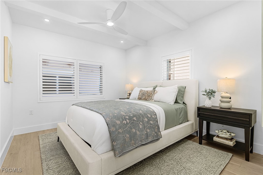 Discover coastal living at its finest in this stunning 2 bed/2bath condo that puts you just steps away from pristine Gulf waters right on Bonita Beach! This turnkey, 1300 sq ft. retreat, offers breathtaking Gulf views from every living space, making each morning coffee a memorable experience. The open floor plan seamlessly connects the living areas, enhanced by decorative ceiling beams and modern recessed lighting that creates an inviting atmosphere. The kitchen showcases elegant quartz countertops paired with crisp white shaker cabinets featuring soft close functionality, complemented by brand new stainless steel appliances, built in wine fridge and hood. Tile flooring flows throughout the entire unit, providing both beauty and easy maintenance. Two private patio spaces extend your living area outdoors. One private patio is accessible from primary bedroom and the other opens from the dining room/living space perfect for enjoying Gulf breezes and sunset views. The primary bathroom features dual vanity sinks, custom cabinetry, an oversized tiled shower with seamless glass doors, and luxurious quartz countertops. The guest bathroom mirrors this quality with new cabinets, quartz surfaces, and a sleek glass shower door. Practical amenities include an in unit laundry room and new, never used furnishings that convey with the sale. The building offers a community pool and sits directly on the Gulf, providing immediate beach access. Located on Bonita Beach with convenient proximity to Publix, restaurants, shopping, Lover’s Key State Park, Marina’s and Fort Myer’s Beach. This coastal haven combines luxury living with everyday convenience. Whether you're seeking a permanent residence or vacation retreat, this immaculate condo delivers the ultimate Gulf Coast lifestyle.