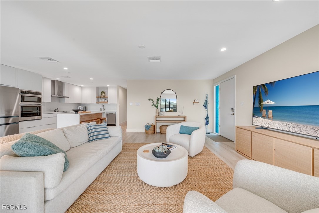 Coastal luxury can be found in this stunning, newly done, 2-bedroom, 2-bath condo just steps from the beach. Tastefully reimagined from top to bottom, the bright and open floorplan features modern finishes designed for your comfort and enjoyment. The impact sliders pocket back and invite in abundant natural light and showcase serene Gulf views that make every day feel like a peaceful getaway. The contemporary kitchen offers sleek cabinetry, quartz countertops, quality appliances, and ample counter space. Both bathrooms have been thoughtfully designed with stylish fixtures and refined details. The spacious primary suite includes a walk-in closet and locked owners closet. This condo also includes rare and highly sought-after conveniences: in-residence laundry, a private garage, plus an additional storage room, ideal for beach gear, bikes, or seasonal items. Sunset South offers a community pool, community room, and on-site manager in a convenient island location near dining, bike path, and local attractions. This move-in-ready condo blends modern comfort with effortless coastal living.